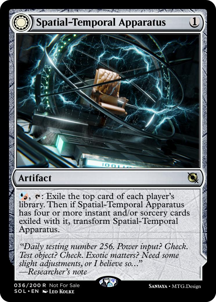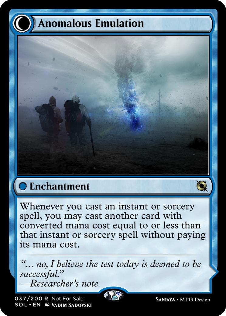 = A Green Enchantment that transforms into a Blue Instant (Yes that can happen, if you make this happen make sure to signify that when it transforms that it instantly resolves and gets put into the graveyard).