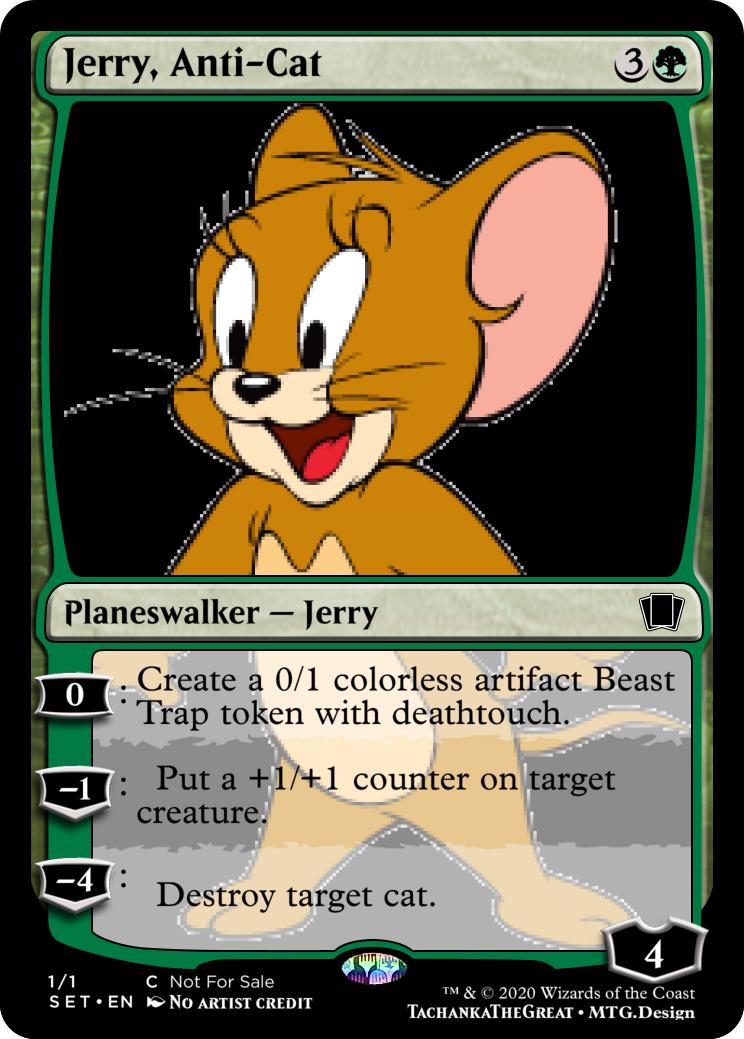 Well....okay let's do this. Ability #1: maybe make it crank out trap tokens that are artifacts with a function, rather than 0/1 creatures called "beast trap"? Ability #2...okay, Ability #3. make sense, but Jerry never killed Tom. Maybe tapping it, or exiling it while Jerry's in play?